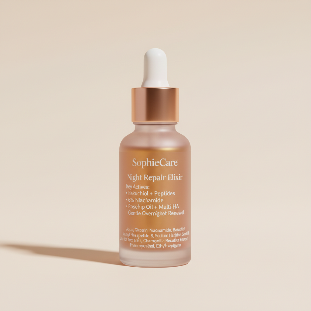 SophieCare Night Repair Elixir is the luxurious overnight treatment with gentle peptides, bakuchiol, and calming florals to repair, plump, and restore skin while you sleep.
